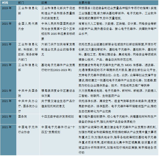 2023电子器件行业:随着工业互联网的融合发展行业模将快速增长电子器件是指在真空、气体或固体中,利用和控制电子运动规律而制成的器件,分为电真空器件、充气管器件和固态电子器件。在模拟电路中作整流、放大、调制、振荡、变频、锁相、控制、相关等作用;在数字电路中作采样、限幅、逻辑、存储、计数、延迟等用,充气管器件主要作整流、稳压和显示之用,固态电子器件如集成电路。 摘自锐观网《中国电子器件产业链布局全景梳理与招商策略建议深度研究报告》 近年来,为了促进电子元器件行业的发展,我国陆续发布了许多政策,如2021年中国电子元件行业协会发布的《中国电子元器件行业“十四五”发展规划》加强产业统筹协调。建立健全电子元器件产业发展协调机制,加强协同配合和统筹推进,积极推动解决产业发展中重大事项和重点工作。加强央地合作,指导各地统筹规划基础电子元器件重点项目布局,适时推进主体集中和区域集聚。做好重点领域监测分析和跟踪研究,加强与现行相关政策衔接,有序推进各项行动。 图表:电子元器件行业部分政策
