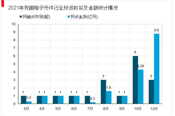 2021年我国电子元件行业共发生投融资事件18起,其中10月份发生的投资数量最多,达6起;投资金额最高的为12月份,投资金额为8.08亿元。