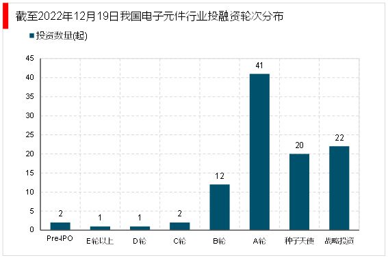 截止至2022年12月19日,电子元件行业共发生投融资事件101起,其中发生的A轮投资事件最多,达到 41起,其次为战略投资,达到22起。