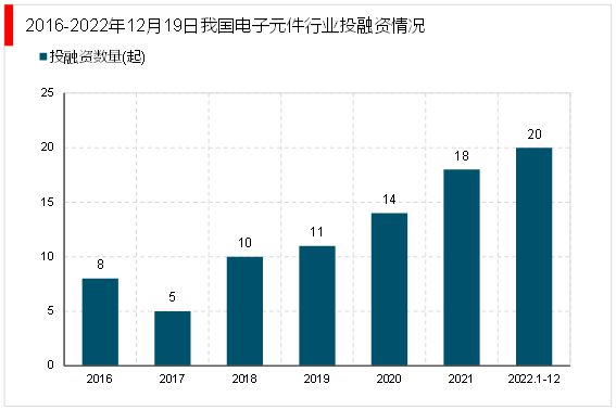 电子元件是电子电路中的基本元素,通常是个别封装,并具有两个或以上的引线或金属接点。电子元件须相互连接以构成一个具有特定功能的电子电路,例如:放大器、无线电接收机、振荡器等,连接电子元件常见的方式之一是焊接到印刷电路板上。电子元件也许是单独的封装(电阻器、电容器、电感器、晶体管、二极管等),或是各种不同复杂度的群组,例如:集成电路(运算放大器、排阻、逻辑门等)。 数据显示我国电子元件投融资事件数总体呈现上升趋势,从2016年的8起上升到2021年的18起。2022年1-12月间投资事件数达20起。 摘自锐观网《中国电子器件产业链布局全景梳理与招商策略建议深度研究报告》